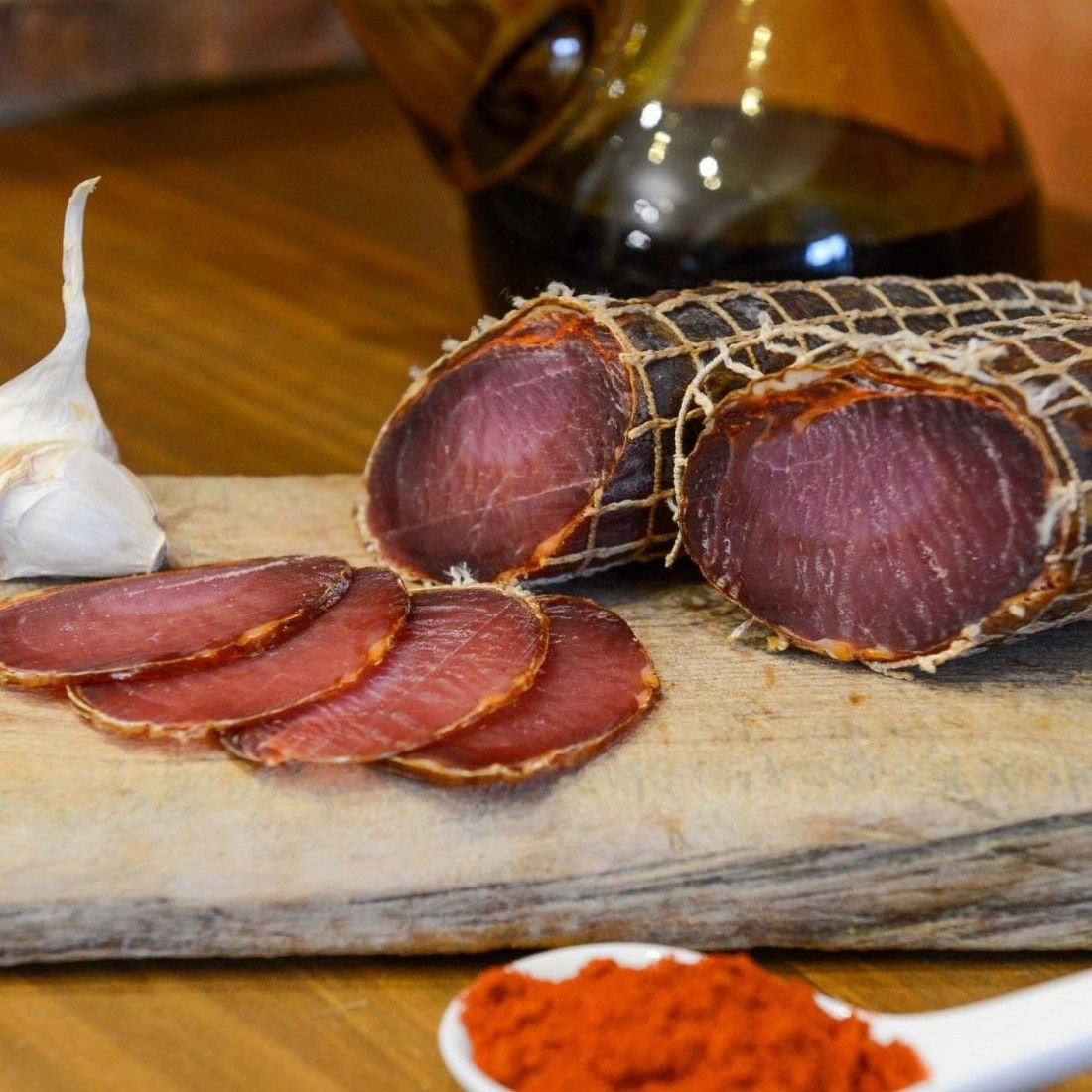 Seleccionamos el corte más tierno y magro del cerdo y lo sometemos a un lento proceso de curación artesanal. El secreto de su sabor único no solo está en el tiempo de maduración, sino en la cobertura aromática: una mezcla perfectamente equilibrada de romero, tomillo, orégano y otras especias que perfuman la carne y le dan un carácter inigualable.